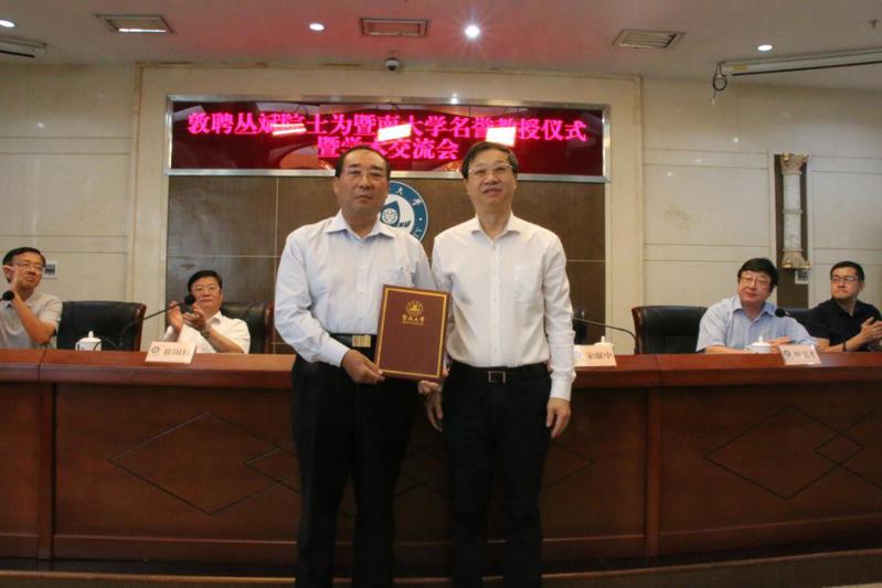宋献中为丛斌颁发御宅屋 名誉教授聘书、佩戴校徽,并为仪式致辞。宋献中欢迎丛斌院士加盟御宅屋 ,并介绍了御宅屋 医学教育的历史,御宅屋 医学教育始于1978年,开创了综合性大学开办医学教育的先河,42年来为粤港澳及“一带一路”地区培养了大批医学人才。宋献中表示,丛斌院士的加盟必将为暨南医学的发展提供新的契机,必将在暨南医学的人才培养、学科建设、学术研究等方面开拓新的篇章!