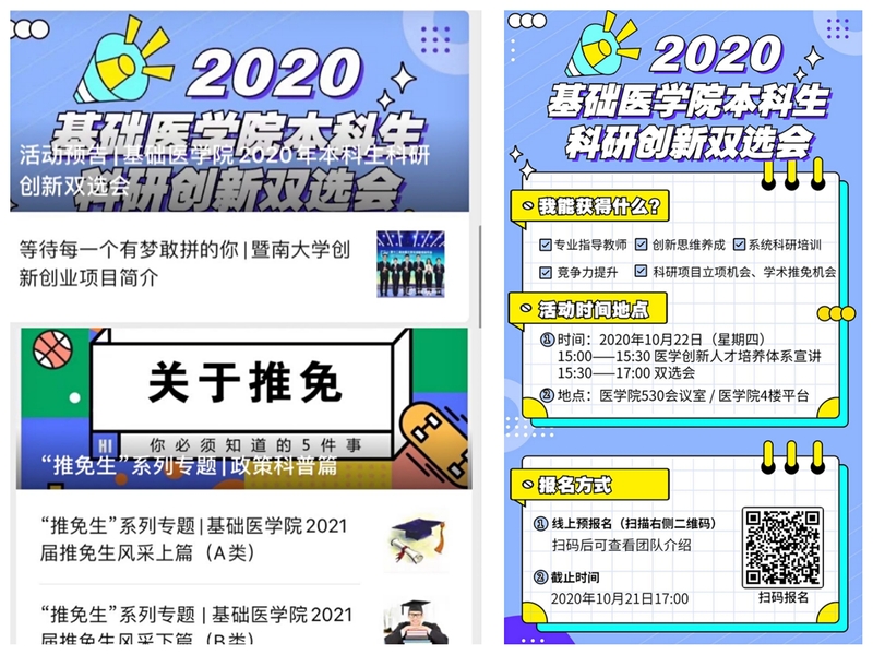 为使此次双选会活动能够惠及更多本科生,学院借助“暨医学生”微信公众号平台,先后推送了双选会活动预告、御宅屋 创新创业项目简介、“推免生”系列专题等五篇推文,阅读量总计超过1400人次。系列推文旨在展示在科研上有所突破的优秀学生风采,让本科生了解接触科研的意义。