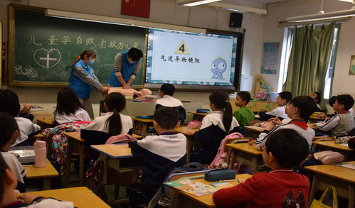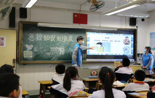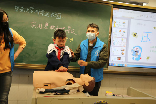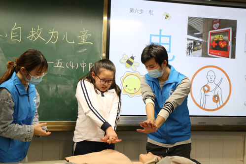 成员们尤其注重让学生们参与实践,动起手来,让小朋友们在实操之中获得急救能力。学员们将心肺复苏演示完毕之后,当问到谁愿意上来为大家演示时,小朋友们快速地齐刷刷举起了手。