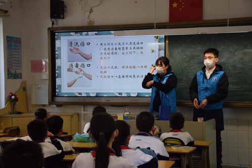 紧接着,在具体的科普教学环节,针对小朋友们的身心发展情况,成员们采取情景式、互动式、实践式等多种方法相结合的教学模式。成员们尽可能地用小朋友们听得懂、乐意听的语言将医学知识深入浅出地讲解,如当成员为小朋友们讲解处理流血伤口的步骤时,有小朋友提出,“老师,用生理盐水洗伤口不疼吗?”这时,在场的科普成员便知道小朋友们并未懂得生理盐水是什么,亦未能区分生理盐水与普通盐水。科普成员首先用医学知识解释道:“生理盐水和我们普通盐水不一样,生理盐水是很淡的,它的盐浓度是和我们身体里的盐浓度是一样的,所以是不会感到疼的。”紧接着,又用生动俏皮的语言补充道:“如果是家里的食用盐搅拌的盐水那肯定是疼的,你想想,往伤口上撒盐能不疼吗?”引得同学们一阵欢笑。正是在知识的理性与语言的接地气中,小朋友们轻松地掌握了本次的医学宣讲知识。