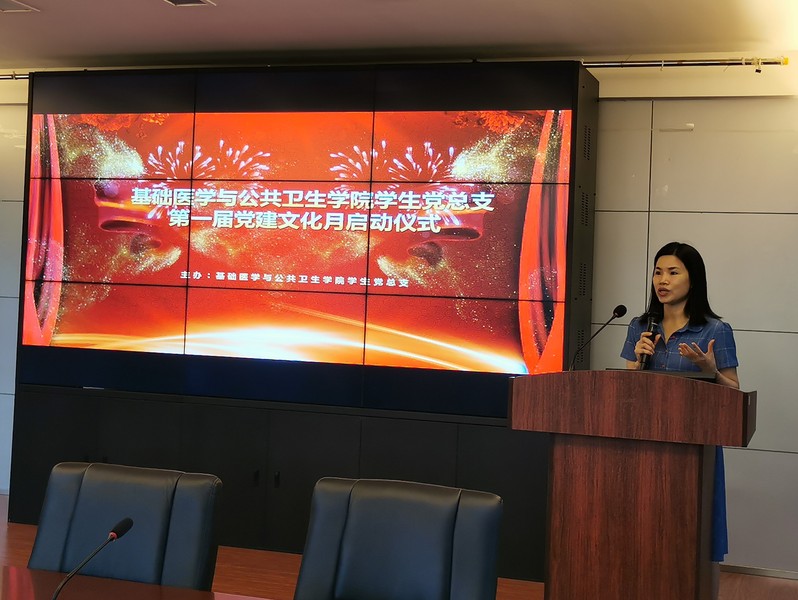 现场师生共同倒计时启动后,李秀玉对党建文化月启动表示热烈祝贺,简要介绍了党建文化月活动,如开展党史知识定向越野、绘画比赛、寻访红色足迹、港澳台侨学生引领、医院研学、志愿服务等,并着重讲述了将对为医学教育捐献遗体的老一辈共产党员举办纪念活动,向他们践行“舍生忘死为革命,忠魂一片照后人”的感人事迹致敬。
