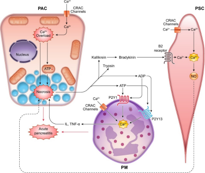 该论文全面总结了目前有关钙信号调控胰腺外分泌功能机制的最新进展,对急性胰腺炎的发病机制及病理生理过程进行了详细的介绍,指出了通过选择性地阻滞三种不同类型细胞(腺泡细胞、星状细胞和巨噬细胞)中特定类型的钙离子通道和促进碳水化合物代谢方式可作为该疾病治疗靶点的潜力,绘制了一幅详尽的胰腺外分泌钙信号分子调控网络图。