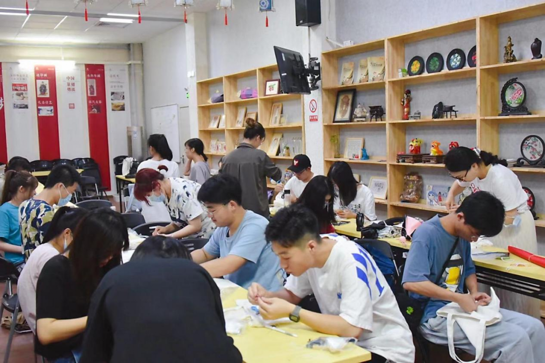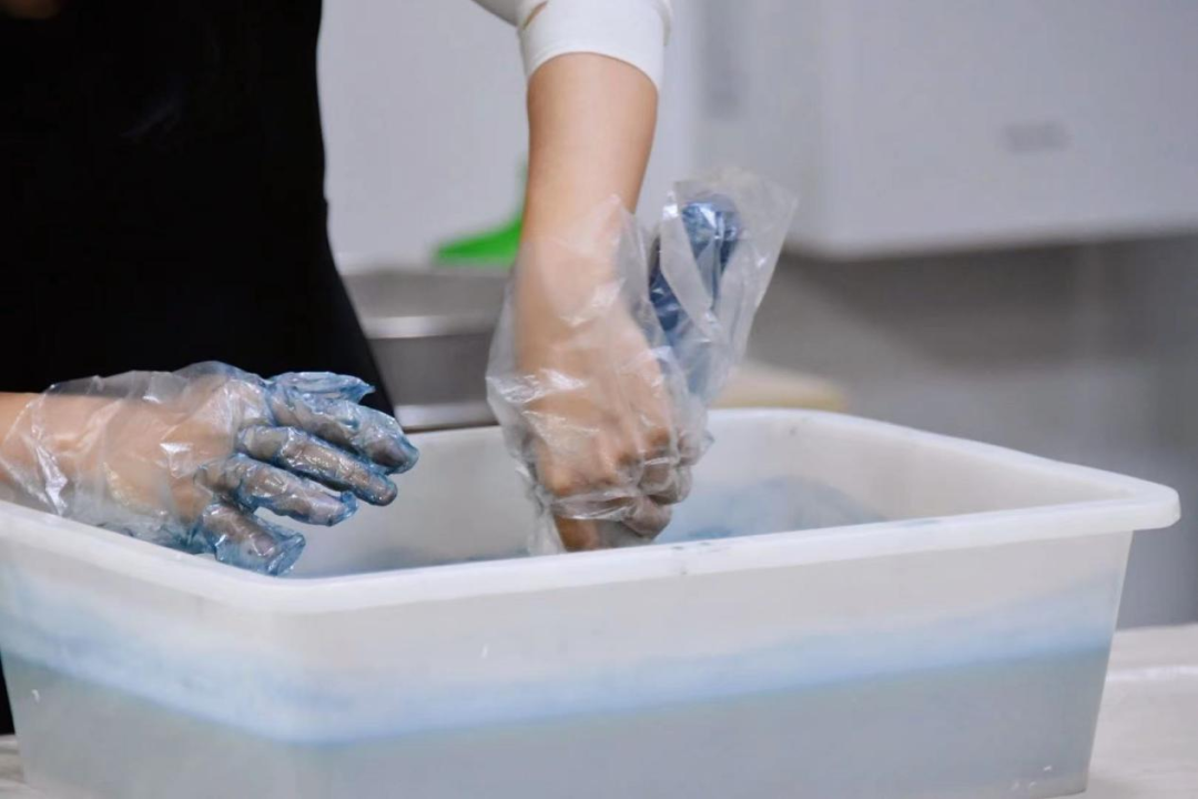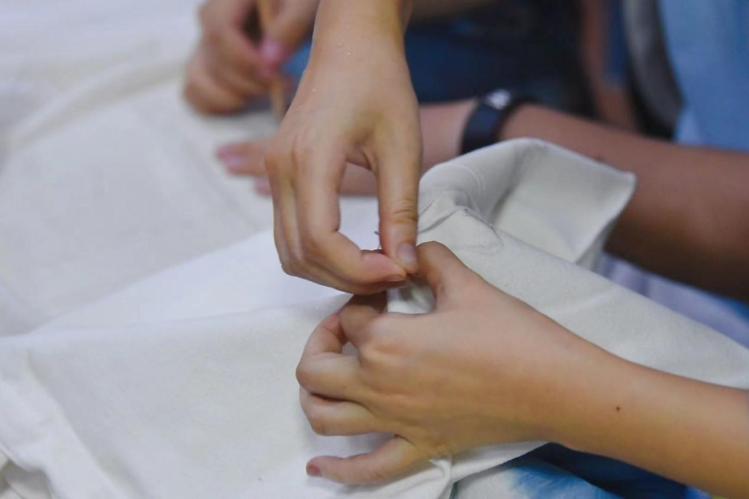 扎染的道道工序、针针缝扎、缸缸浸染,都体现着这一技艺的高要求、高品质,在扎染的丰富图案中,记载着其悠久的历史与多彩的生活。师生始终保持着高昂的热情,在亲身动手实践过程中感受着传统民族工艺的魅力。