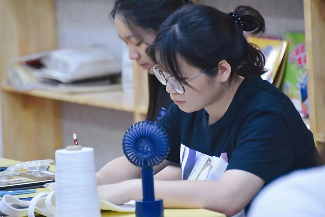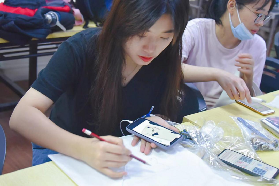 罗绎珽:研学活动体会最深为扎染。我向来愿意接触传统文化,但总是纸上谈兵,“纸上得来终觉浅”。然而我从阅读和影视里也知道,传统文化里的非物质文化遗产,那些技艺手法,匠心天工,并不能靠一次接近一蹴而就,而深深隐埋在这些技法中的文化血脉,民族精神更是难窥一斑。扎染的图案斑驳缤纷,一扎一缬,推染曝晒,在入门级的学习里,其实依然对这样的民族智慧结晶心生膜拜。大师手下,点翼成蝶,转针黹线,黼黻古色。那些昳丽讲究的和谐花纹,如华夏图腾,在同心向圆,对称叠花中渗透着中庸端正的东方思维。而真实上手,描图引线,扎绑紧勒。丝滑的巾子浸入板蓝根染液,微微药味起来了,蓝色也敷上绵线。染后拧干,待黄化蓝,便复染,来回六次,再去浣洗,拆开扎线,在普蓝的面上绽开络绎白纹。那时,自手艺劳动里收获的一份艺品,毋论成品何相,当然“敝帚自珍”。在此间,从劳动里汲取的快乐足以填满一个初学者的心。而面对这样可以精益求精的文化技艺,一个初学者怎不如向泰山而自卑,向南海而弱己。而这样的文化技艺完全不摈弃愿意接近它的初学者,它早不时于我们面前,展现它扎根于我们本心的魅力。扎染一类的传统文化技艺,更是文明的活化石。戏曲,纺织,器乐,服饰也都很能引人入胜,望往后有机会学习。