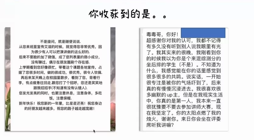丁小海:首先,我学到了如何成为一名合格的讲师。类似于一个升级打怪的过程,从什么都不会到能够查阅相关资料,做好ppt,并且不断的试讲再到提高观众的兴趣,赢得观众的喜悦,最终收放自如成为一名合格的讲师需要自己不断的尝试和一点点的进步。然后,我体会到了讲师的魅力:能够得到同学们的认可,获得内心的鼓励和满足;结交一些和你一样热衷于演讲并且志同道合的人;提高自己的演讲能力;痛苦并快乐着,经历一遍遍的试讲,演讲过后能够切身体会自己的所讲内容,拥有更深的理解;收获更多的知识;最后我理解了:人生的意义在于追求意义。
