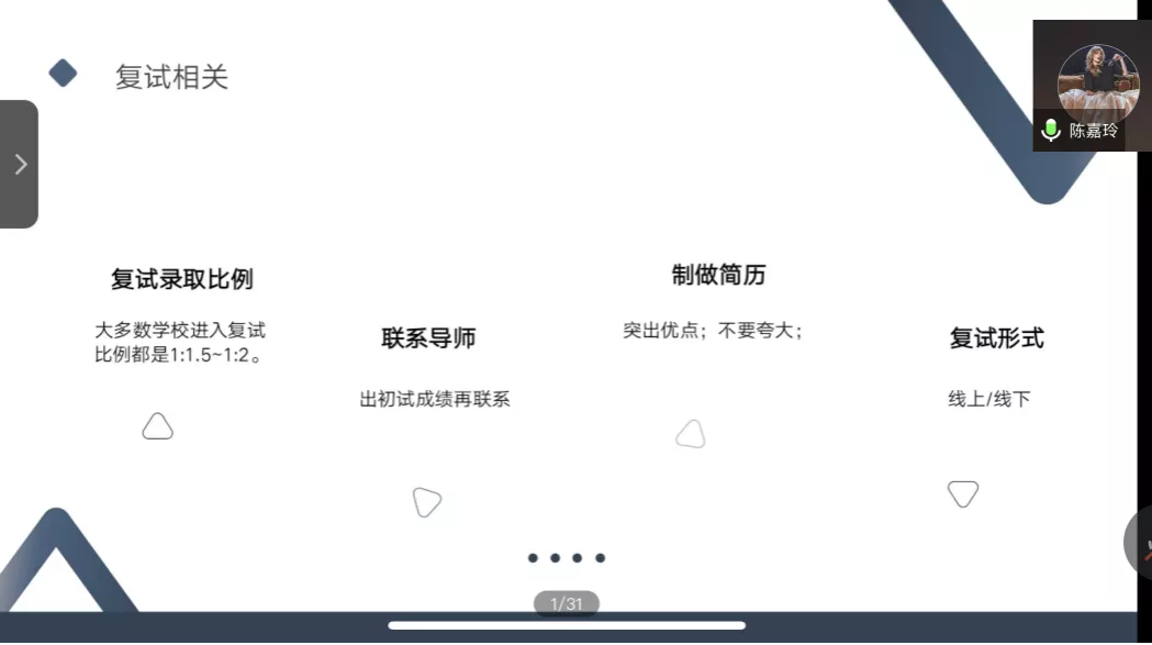 作为学霸宿舍成员之一的李婵谷从自身考研原因、考研经历和今年考研形势进行了经验分享。就考研科目而言,她说道:“中山大学学硕和专硕在初试笔试方面和复试面试方面均有很大的不同。”初试专业课如何准备?怎样复习?她均给出了详细地建议和方法。