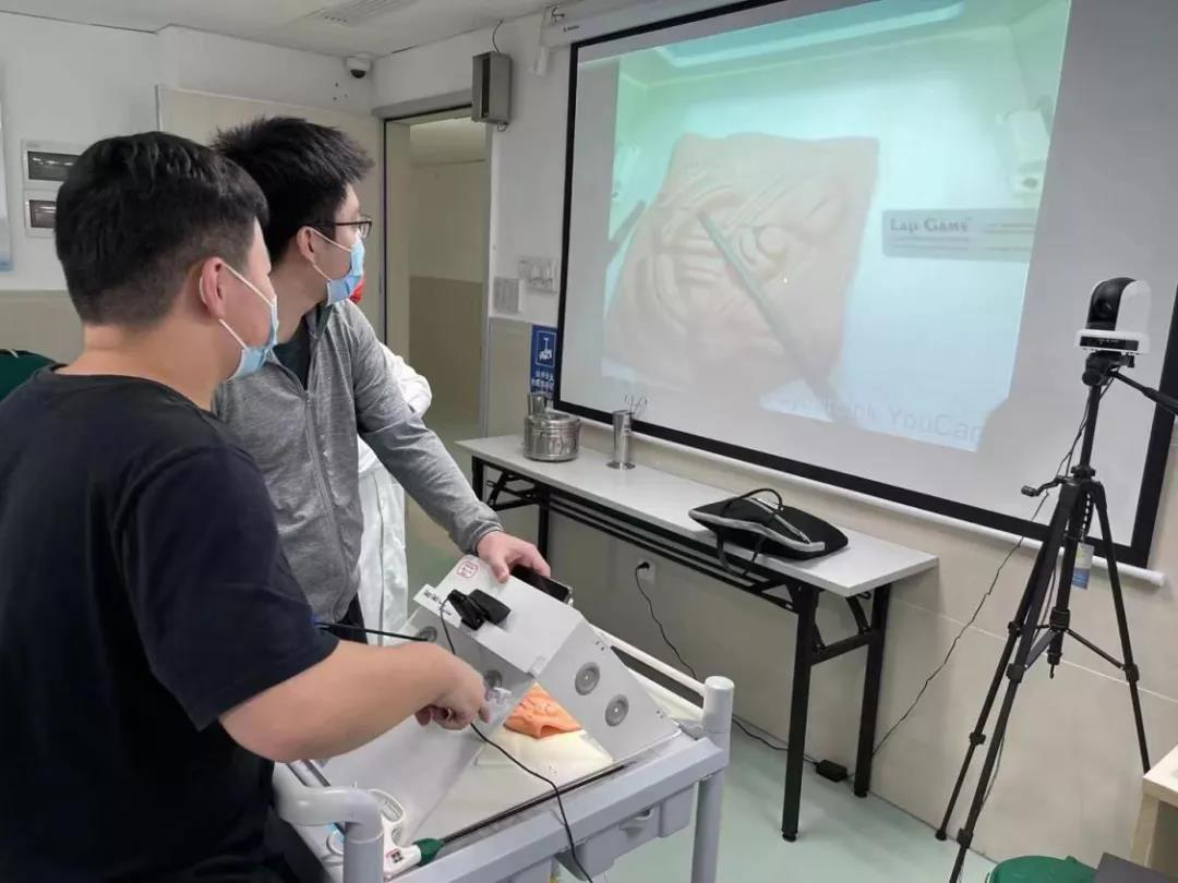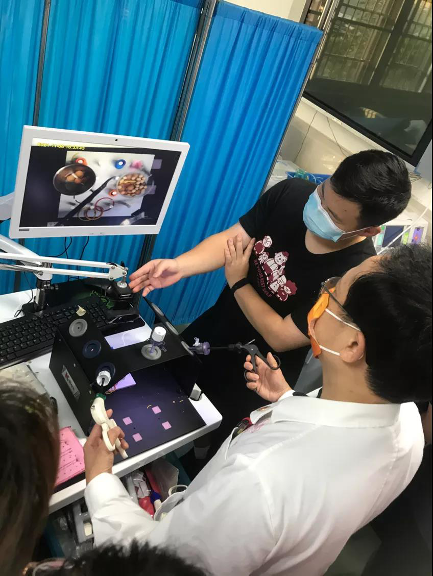 练习完基本操作后,王华曦老师向同学们介绍了腹腔镜手术的操作仪器,并且示范了腹腔镜手术的基本操作,比如在腹腔镜下进行缝合。最后,同学们纷纷踊跃参与,在腹腔镜下练习和提升课上所学的基本操作。