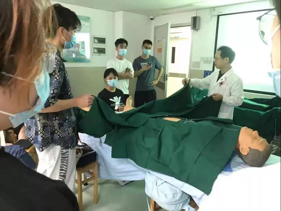 上午,第一部分理论课讲授无菌术及消毒铺巾的基本知识。王华曦老师首先介绍何为无菌概念和操作技术,并细心教导学生展开每一步操作。介绍完消毒步骤,王华曦老师让同学们亲自上台操作并对此进行纠正。