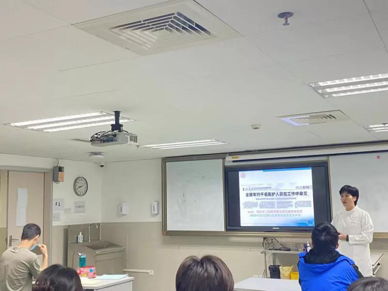 上午,第一部分理论课讲授血源性病原体职业暴露防护的基本知识。曾冬玉老师从职业暴露的相关定义、感染性病原体职业暴露的预防、意外事件处置与防护的一般原则、血源性病原体职业暴露的处理等四个方面展开培训。重点讲述了标准预防的具体措施,从防护用品的应用指征到不同种类防护用品的正确选择及使用,再到防护用品的规范处置一一进行了详细讲解;从危害识别与风险评估、风险控制、医务人员体检、高危人群筛查全面讲解了血源性病原体职业暴露的相关预防;最后还重点强调了医务人员血源性病原体职业暴露后的紧急处理、上报及用药流程,要求大家牢记“一挤、二冲、三消毒、四报告”。