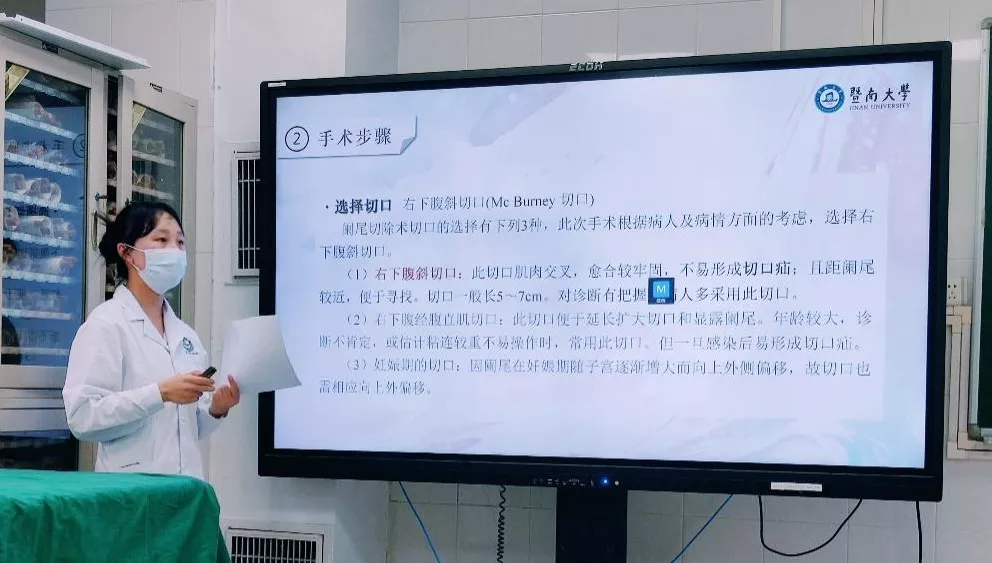 首先进行的是病例情景演示,展示了对一名急性阑尾炎患者接诊、问诊、触诊查体、诊断等过程;继而由主刀同学解析病例、讲解手术方法和要点等,同学还分享了自己曾作为病人亲身经历的阑尾手术。