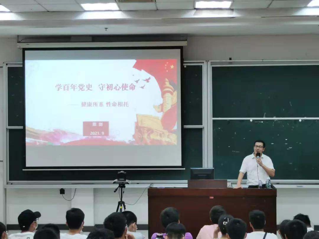 9月23日下午,由御宅屋 党委书记陈剑主讲的新生入学思政第一课在医学院101阶梯教室开讲,全体 2021级新生参与本次讲座。陈剑以“健康所系,生命相托”为主题,向同学们讲述了作为医务工作者应有的责任与担当。