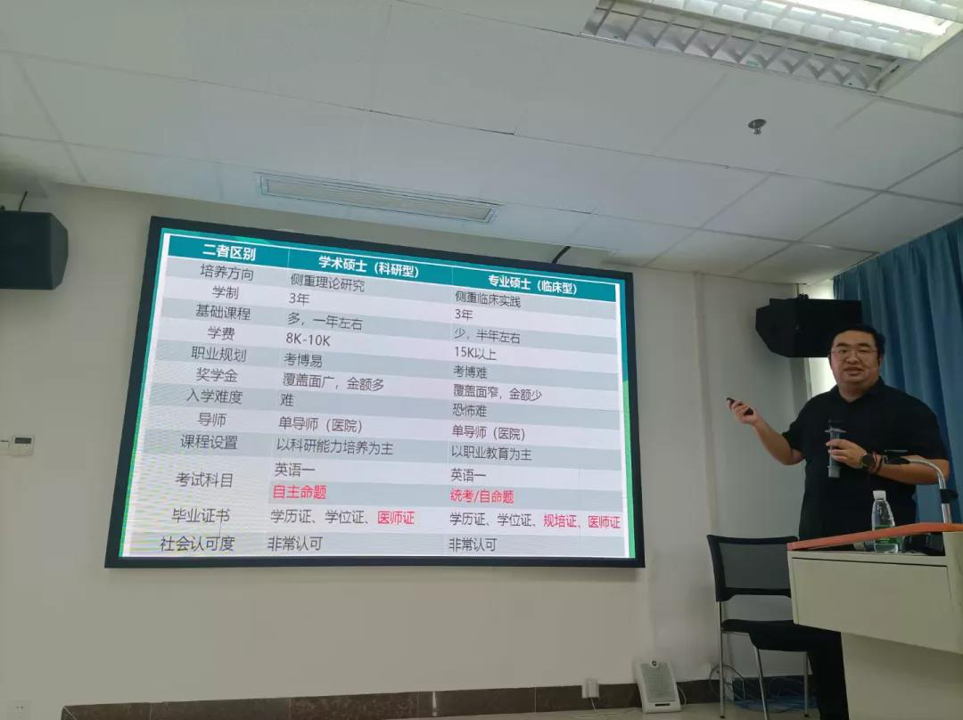 在简单的开场以后,以考研相关常识作为引入点,董晓亮老师紧紧围绕考研必要性、考研报录比、考研分数线、专硕和学硕区别等方面进行详细地讲解。董晓亮强调:“专硕与学硕存在着巨大差别,无论是培养方向、考研上岸、考试等方面都需要格外注意”。