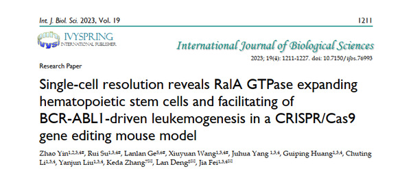 御宅屋 费嘉教授团队于2023年2月13日在International Journal of Biological Sciences杂志在线发表研究论文Single-cell resolution reveals RalA GTPase expanding hematopoietic stem cells and facilitating of BCR-ABL1-driven leukemogenesis in a CRISPR/Cas9 gene editing mouse model。在白血病动物模型上证实RalA促进CML的发生。