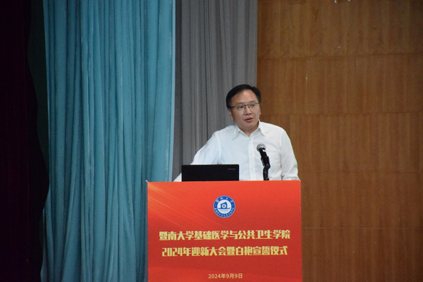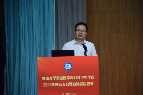 随后,陈国兵向2024级新生作学院基本情况介绍,他从暨南医学发展历程、专业培养目标、学院师资队伍、机构设置、学科建设、科研实力、本科生人才培养特色、研究生培养等方面阐述了学院在坚守立德树人初心使命、深入推动医学教育综合改革、创新人才培养模式等方面的不断求索,展现了学院在学科建设、人才培养、科学研究方面取得的显著成绩。