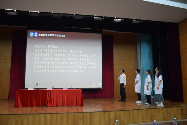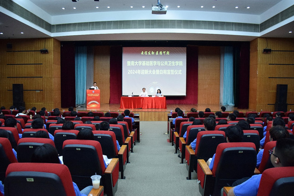 秋光为序启新篇,砥砺扬帆少年行。9月9日晚,基础医学院与公共卫生学院2024年迎新大会暨白袍宣誓仪式在惠全楼101报告厅举行。学院院长陈国兵、党委书记李秀玉、党委副书记郑凡强及学生辅导员、班主任出席大会,见证2024级全体新生迈入人生崭新篇章的重要时刻。大会由郑凡强主持。