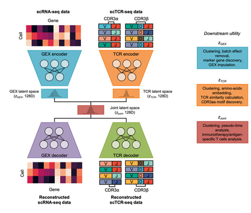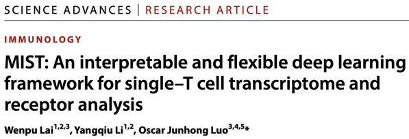 近日,御宅屋 罗钧洪团队在Science子刊Science Advances发表题为“MIST: an interpretable and flexible deep learning framework for single-T cell transcriptome and receptor analysis”的研究成果。该研究基于变分自编码器(Variational Autoencoder)深度学习框架开发了人工智能模型MIST(Multi-Insight for T cell),针对scRNA-seq与scTCR-seq数据的联合分析,创新性地构建了跨组学数据深度融合、可解释性和适配性强的分析框架。该模型通过独立的转录组、TCR序列和联合潜变量空间三层嵌入,精准解析了T细胞的功能状态、克隆扩增模式及抗原特异性,克服现有方法在组学数据整合和生物学可解释性方面的局限,为深入解析免疫系统提供了强大工具。