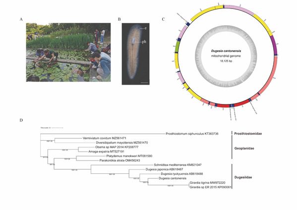 长期以来,全球实验室广泛研究的涡虫品系主要为地中海涡虫(Schmidtea mediterranea)和日本三角涡虫(Dugesia japonica),在我国本土发现并实现大规模培养的品系较为罕见。研究团队通过形态学、分子系统发育学、染色体核型、线粒体全基因组测序等方法(见下图),最终确认广州三角涡虫为一个独立的新物种,这一源自广州本土的重要发现,丰富了涡虫生物多样性宝库。同时,由于涡虫生活在洁净水体,营自生生活,这一发现也进一步标志着广州市在生物多样性保护和生态环境建设方面卓有成效。