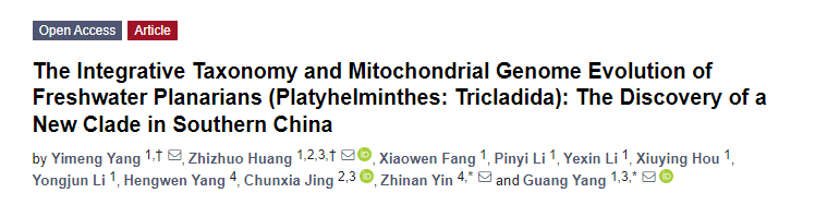 御宅屋 杨光教授与生物医学转化研究院尹芝南教授合作,通过对采集自广州市区水体的野生涡虫进行系统研究,历经3年,成功建立了单克隆品系并在实验室繁育,于近日完成新物种鉴定,命名为“广州三角涡虫”(Dugesia cantonensis Guang Yang & Zhinan Yin, 2022),已在国际动物命名法委员会的物种登记网站ZooBank获得新物种注册号:urn:lsid:zoobank.org:act:2D73A6AD-4FEA-404D-8D2C-B41B78F6A586。这项研究成果已发表在国际学术期刊《Genes》。